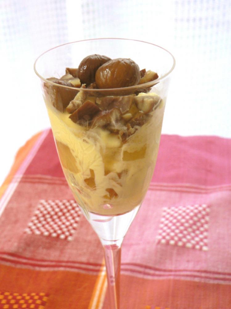 器にシリアル、アイス、「2」のりんごを重ねて、最後に刻んだ甘栗、甘栗の順に乗せて完成!