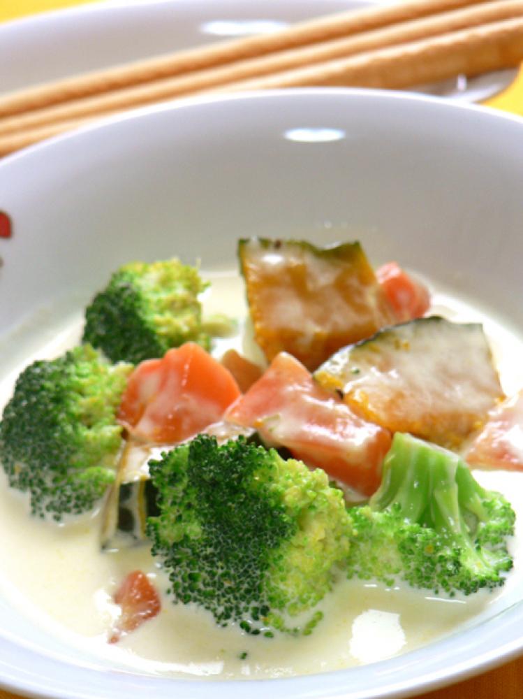 かぼちゃ、にんじん、ブロッコリーは乱切りにして、ルクエに入れ、レンジ600wで5分ほどチン。