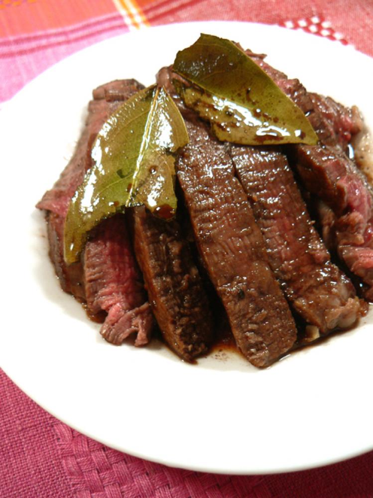 牛肉は冷蔵庫からだして常温にし、フォークで所々刺す。塩コショウをすりこみ、ちぎったローリエを貼りつけて30分置く。