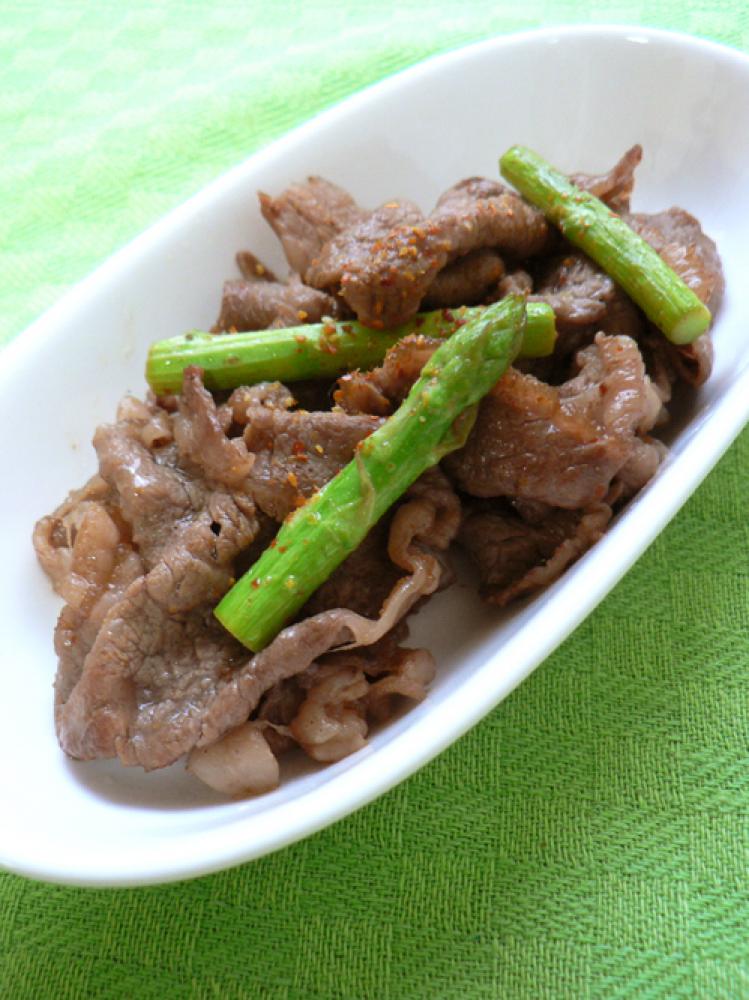 フライパンに油小さじ1、牛肉を炒める。火が通ったらアスパラも追加してさらに炒める。