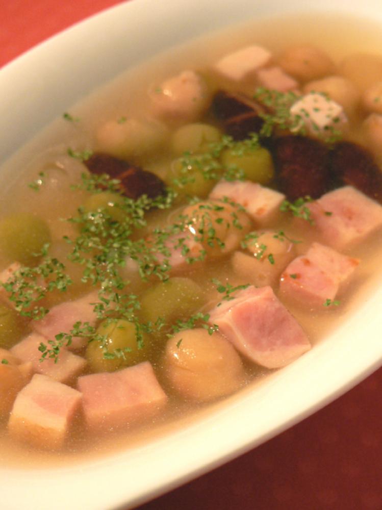 強火で焼き目をつけたらミックスビーンズを追加、最後にコンソメスープを入れ沸騰させたら完成!
