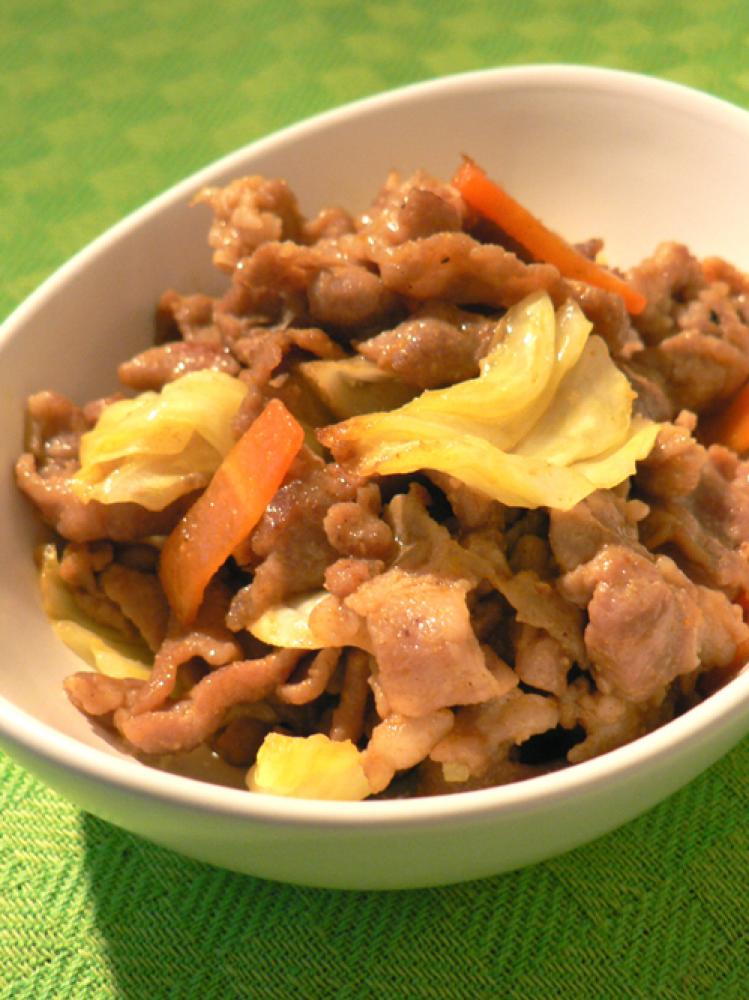 フライパンで豚バラを炒め、キャベツとにんじんも追加。