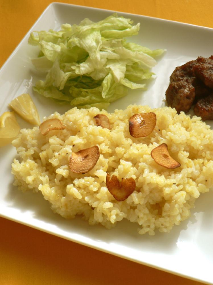 「2」を皿に盛り付け、にんにくスライスを乗せる。レタスとサイコロステーキも盛り付けたら完成!