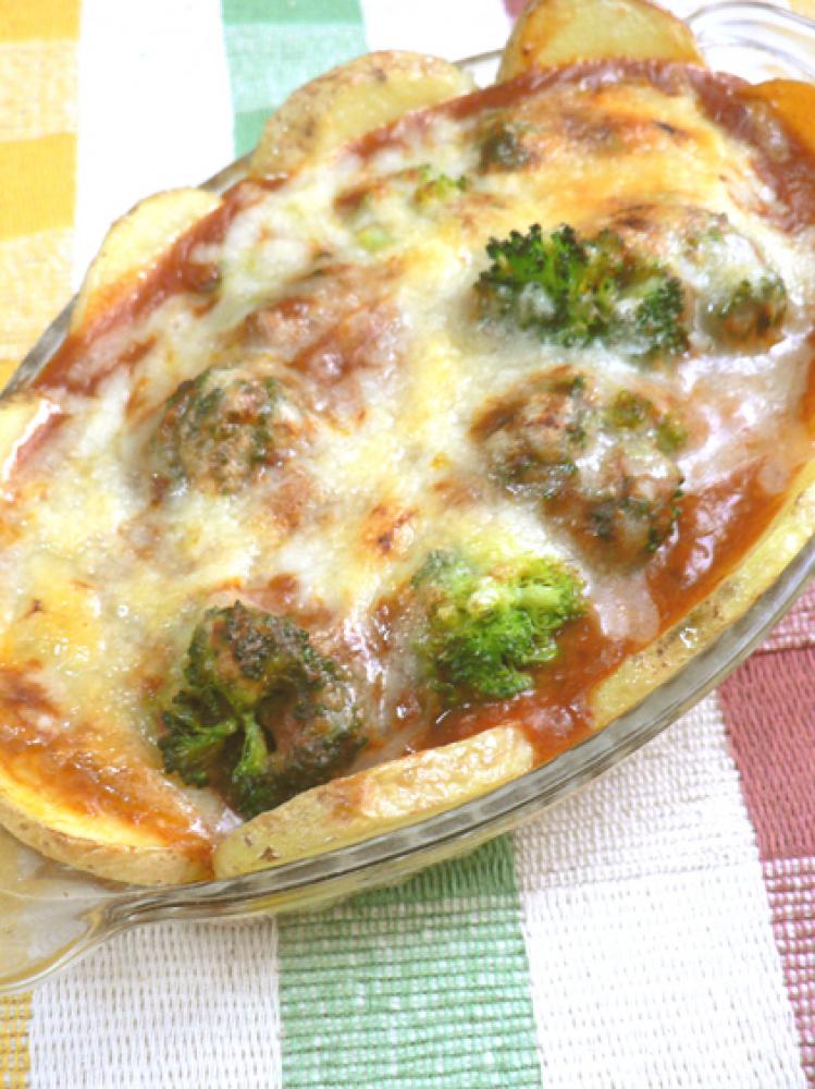 グラタン皿にじゃがいもを敷き、回りにも立てるように並べる。ブロッコリー、ミートソース、チーズの順に乗せる。