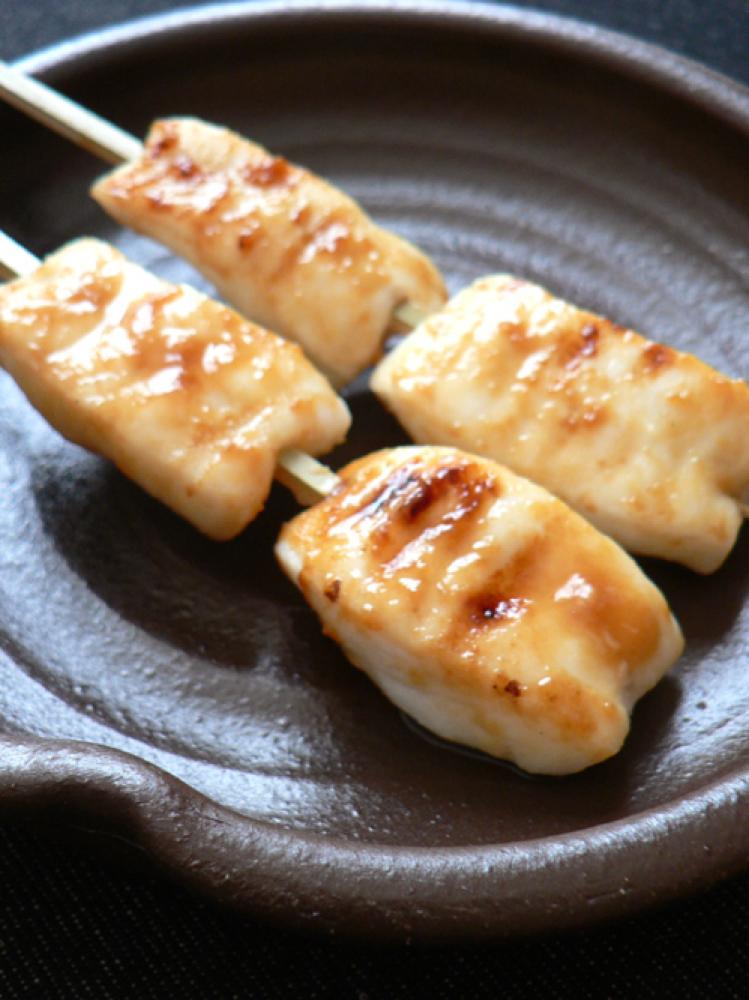 グリルで両面を焼き、最後に<タレ>を塗って焼き目を付ける。串を打ってお皿に盛り付ければ完成!
