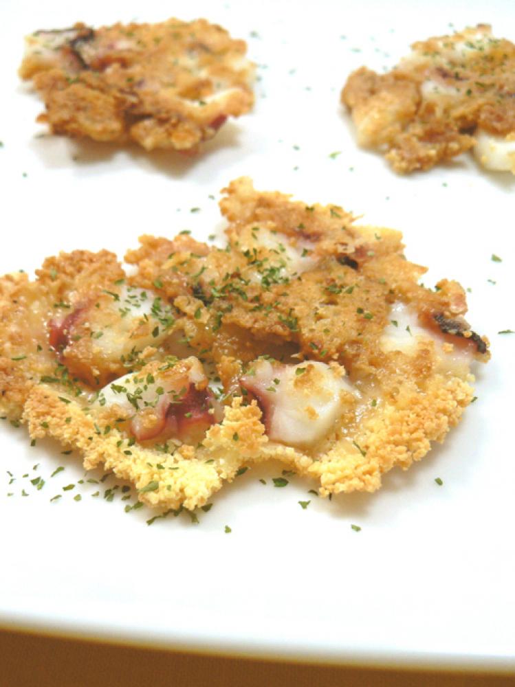 「2」の上ににチーズ小さじ1ずつを広げ、たこ、ガーリックを乗せたら、ふたをして弱火で2分。