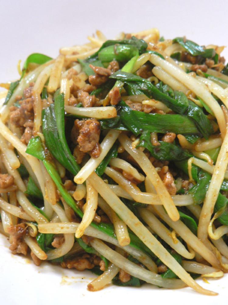 「2」にもやしとニラを追加、カレールーも追加して炒める。最後にしょうゆを追加して、全体に回したら完成!