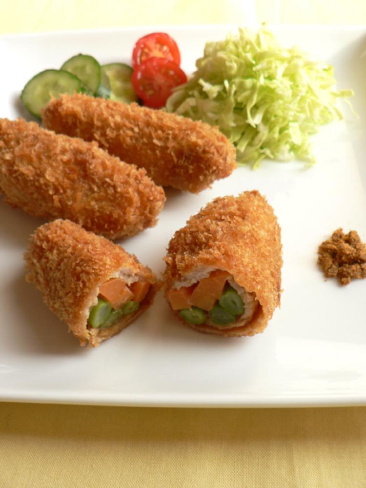 「3」を小麦粉、卵、パン粉の順につけ、ぎゅっと握っておく。170℃の油で1~2分キツネ色に揚げれば完成!
