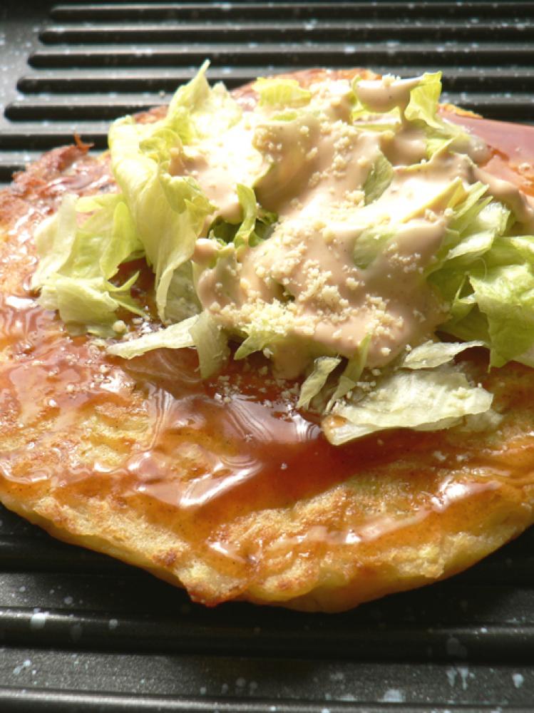 ソースを塗ったらざく切りのレタスを乗せ、ドレッシング、粉チーズをトッピングして完成!