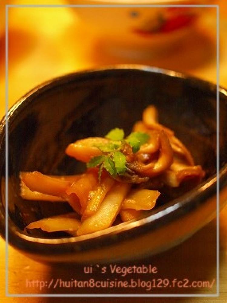 フライパンにオリーブオイルをしいて、熱しウドと舞茸を入れて炒める。