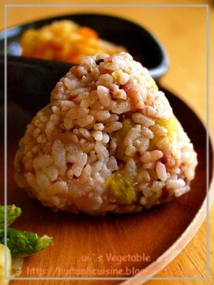 炊き上がったらよく混ぜ、あれば野沢菜や青菜の漬物を細かく切って入れる。無ければお好みで少しお塩を入れてよく混ぜる。