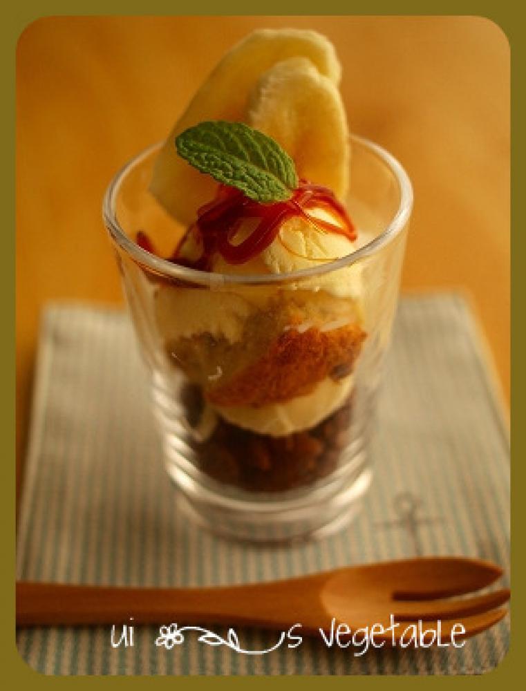 コーンフレークを入れてアイスを重ね、シフォンケーキを入れ又アイスを入れて・・・