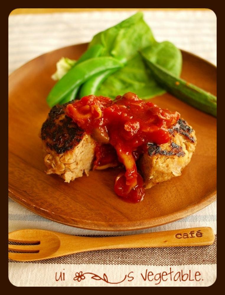 豆ハンバーグを焼いて、トマトソースをかけて出来上がり。