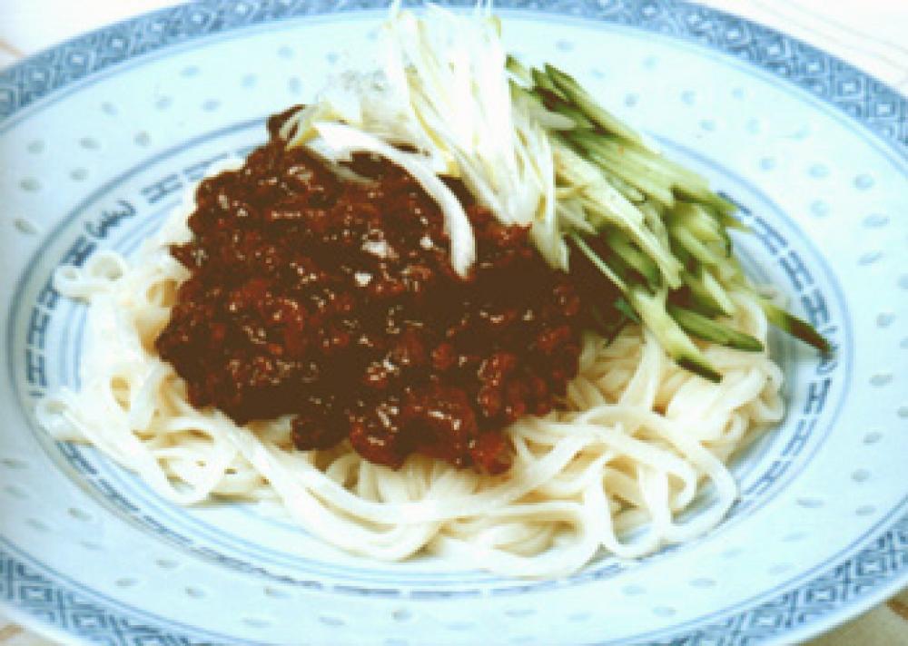 お皿にうどんを盛り付け、きゅうりをのせ、(5)の肉みそをかけてねぎをのせる。