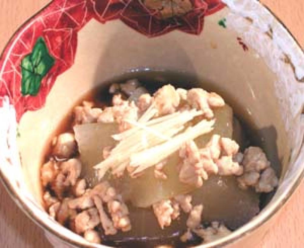 フライパンで鶏ひき肉を炒め、(2)のだし汁を加える。