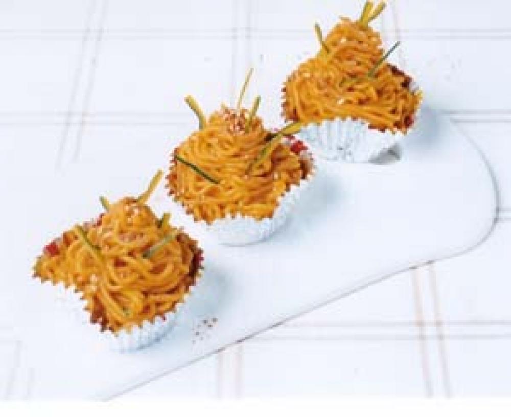 モンブラン用の口金をつけた絞り袋に入れたかぼちゃを絞り、かぼちゃの皮を飾り、ローストしたアーモンドをふる。