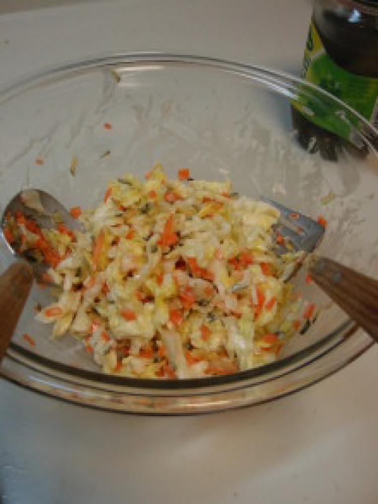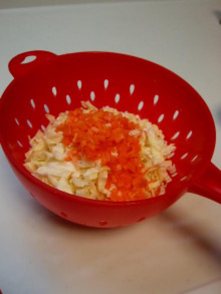 ![]() キャベツとにんじんをザルに入れ、そこに塩(分量外)を小1/2程度ふってしばらく置く。
