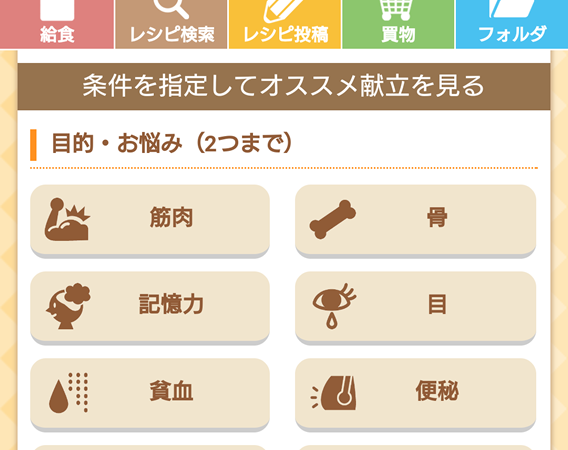 目的・お悩みに合わせたオススメ健康献立(弊社独自基準)を見ることができます。2つまで選択できます。