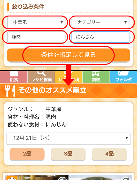 絞り込み条件では、使いたい食材・使わない食材・ジャンル・カテゴリーなどを設定し、お好みに合わせたオススメ健康献立を見ることができます。