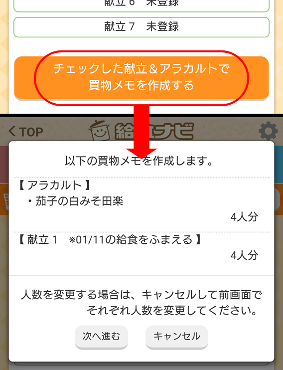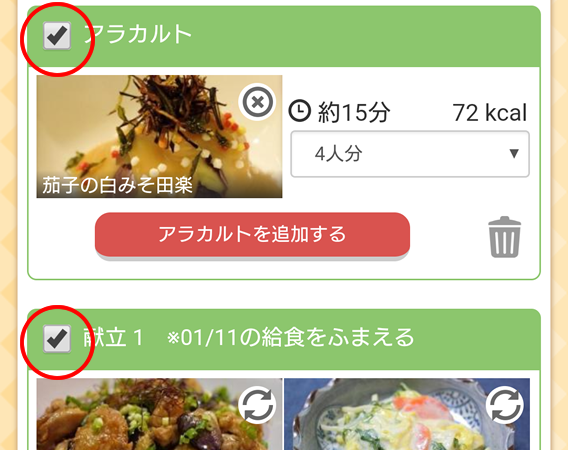 チェックした献立とアラカルトの買物メモを作成できます。分量を自動的に計算してくれて便利です。
