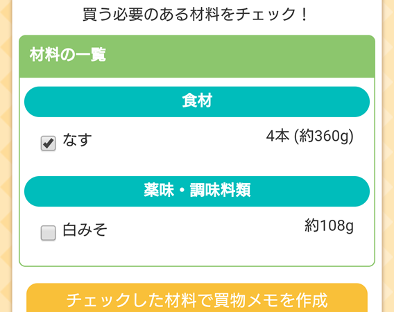 不必要な食材のチェックを外し、必要な調味料のチェックを付けて、買物メモ作成ボタンをタップすると買物メモができ上がります。