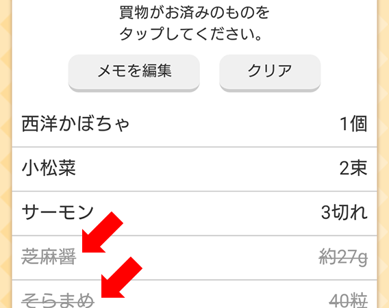 食材名をタップすると、買物時、買物かごに入れた食材をチェックできます。