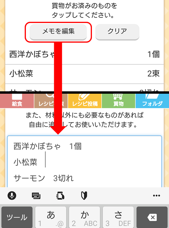「メモを編集」をタップすると、自由に食材や他の買う物を追加したり、分量を変更したりできます。