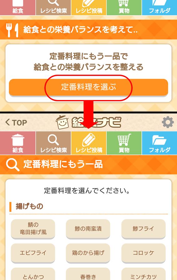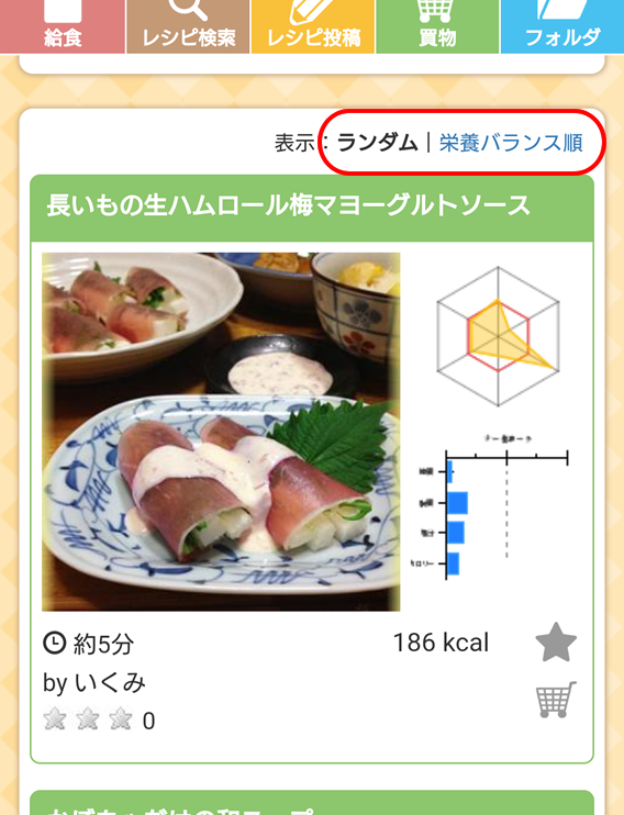 一覧表示はランダムと栄養バランス順で切り替えられます。