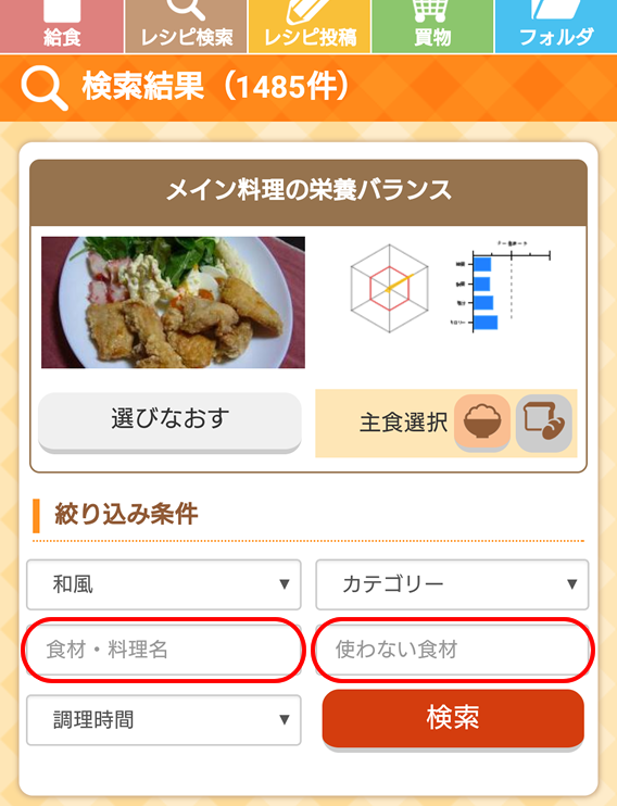 残っている食材・使わない食材を絞り込み条件に入力すれば、よりお好みに合わせた副菜の提案を受けられます。