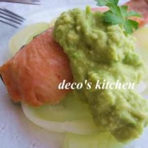 アボカドココナッツソースで鮭のワイン蒸し